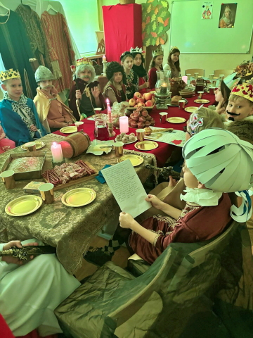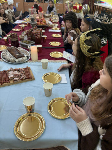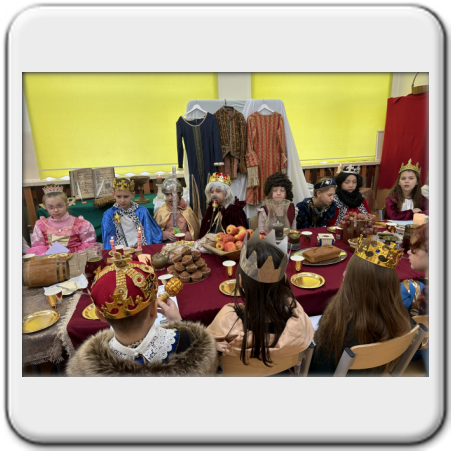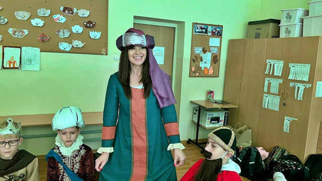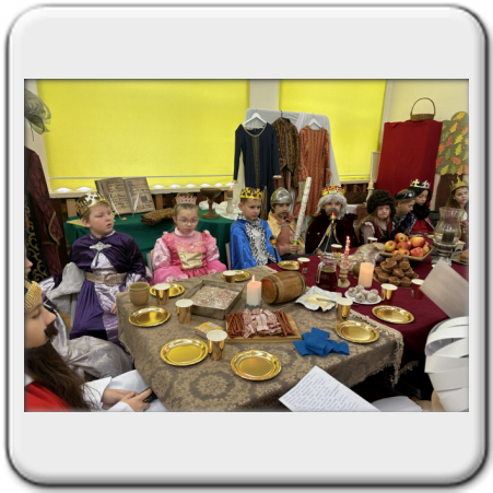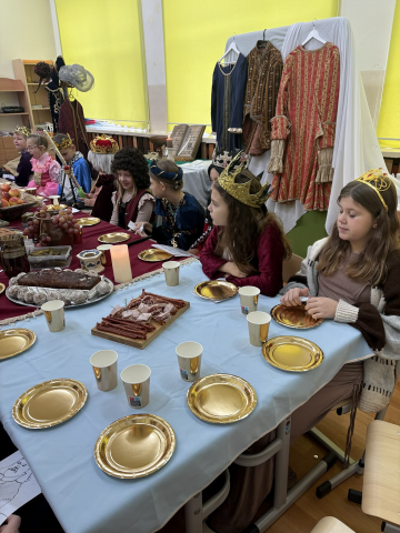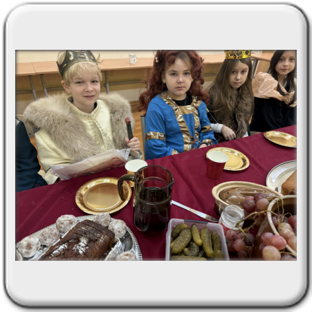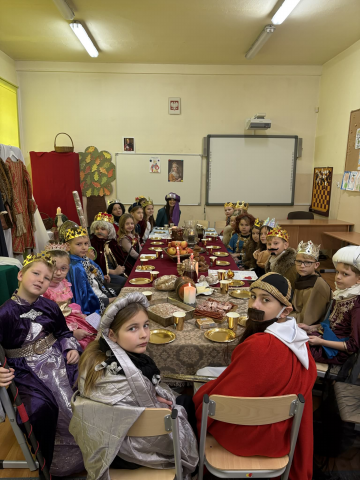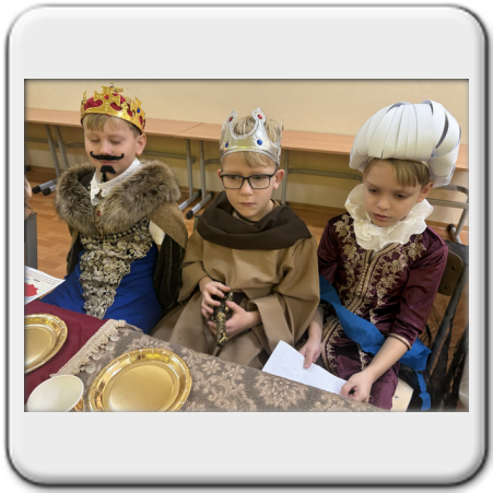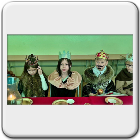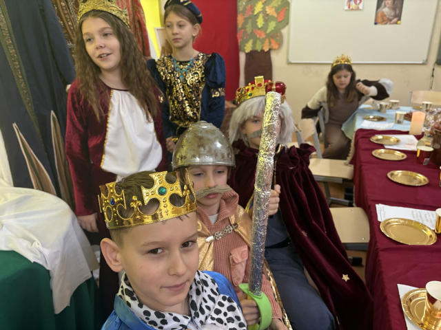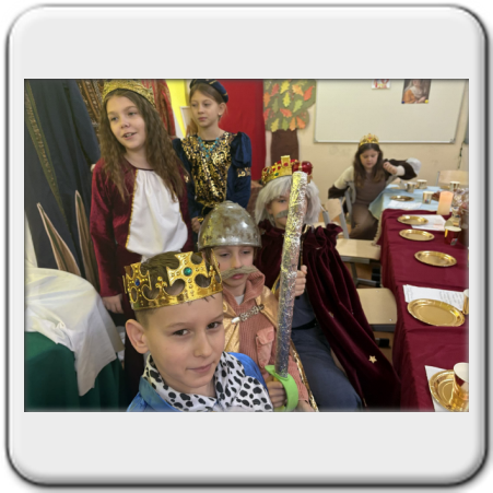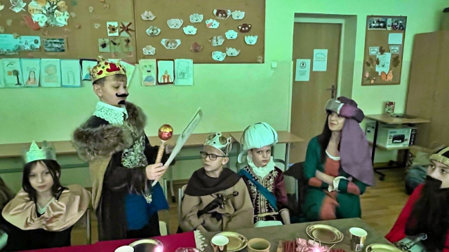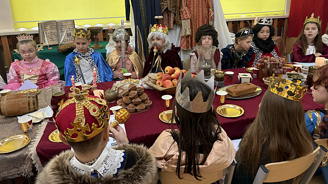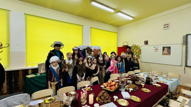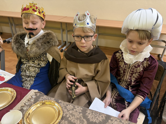 1 grudnia 2025 roku w klasie 3b odbyła się wyjątkowa, niezwykle klimatyczna lekcja historii. Uczniowie wcielili się w role królów i władców Polski, a sala zamieniła się w prawdziwy dwór królewski. Na stołach pojawiły się pyszne potrawy staropolskie, które dodały zajęciom autentycznego charakteru.