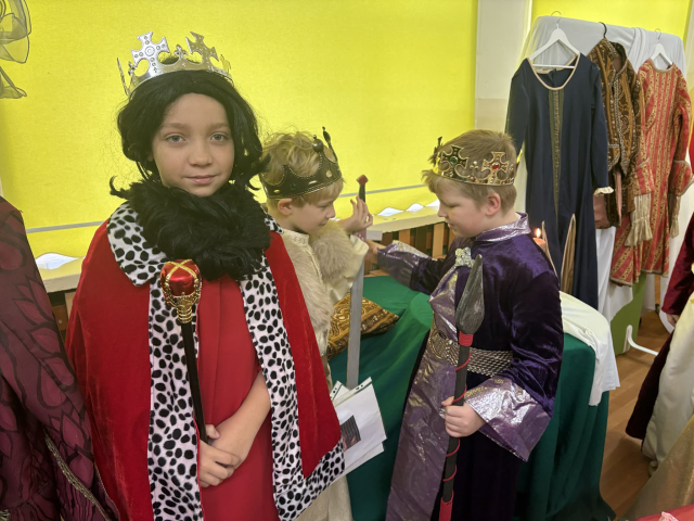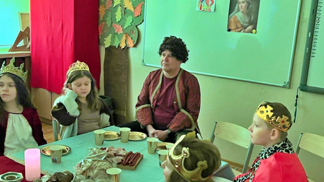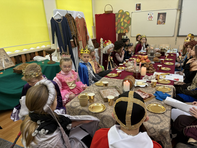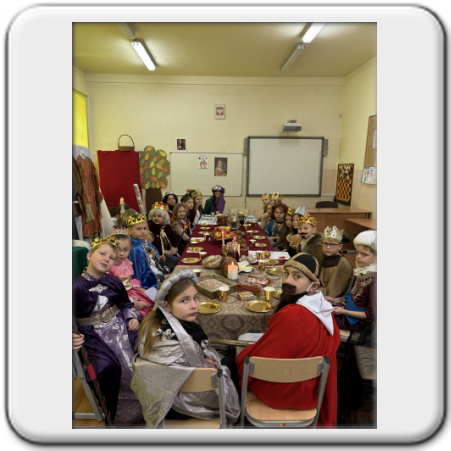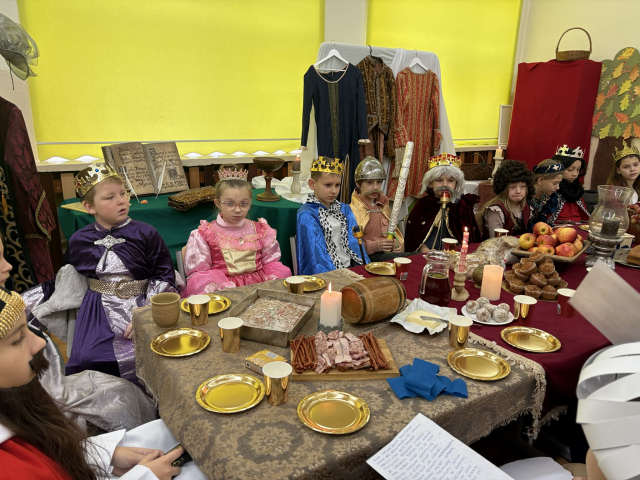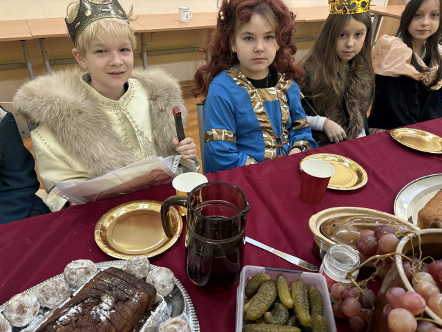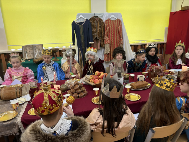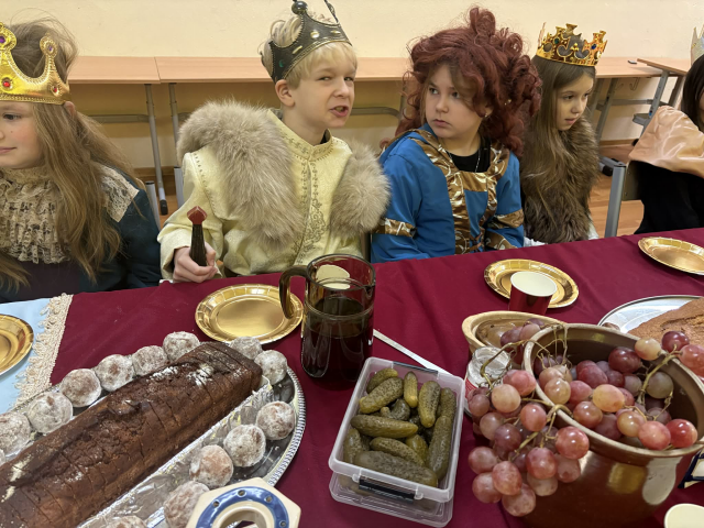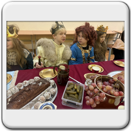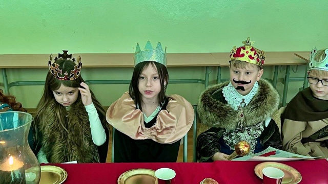 1 grudnia 2025 roku w klasie 3b odbyła się wyjątkowa, niezwykle klimatyczna lekcja historii. Uczniowie wcielili się w role królów i władców Polski, a sala zamieniła się w prawdziwy dwór królewski. Na stołach pojawiły się pyszne potrawy staropolskie, które dodały zajęciom autentycznego charakteru.