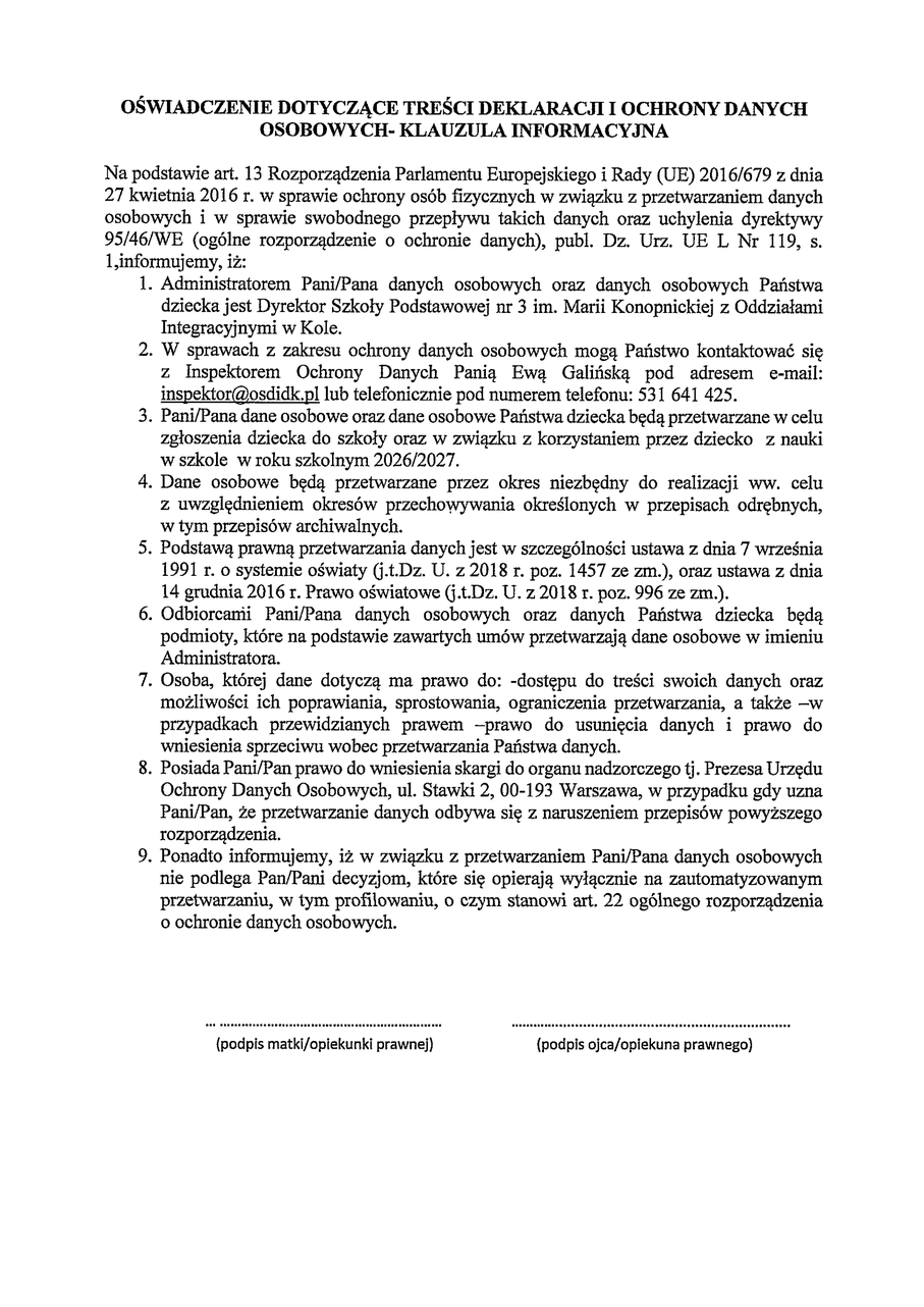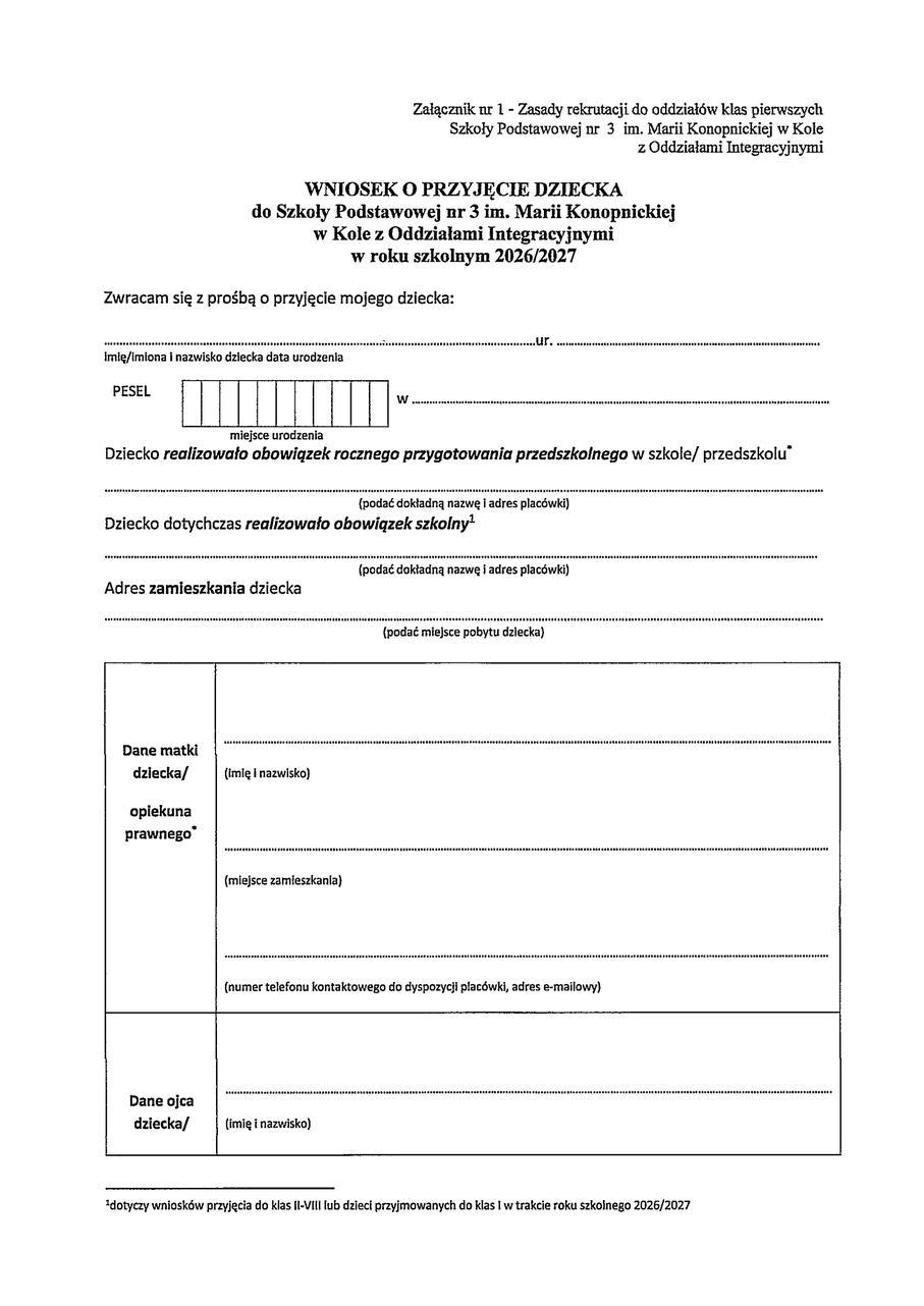 Pobierz - Wniosek o przyjęcie dziecka do szkoły podstawowej nr 3 w Kole